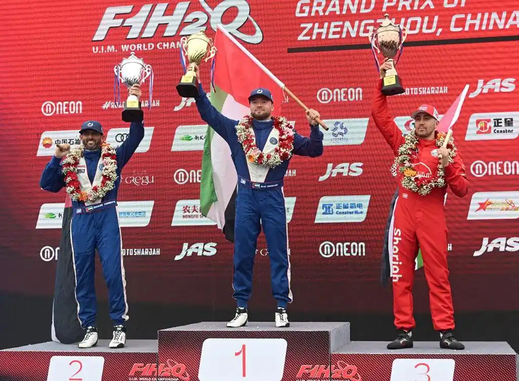 鲜花、奖杯、桂冠……10月12日,在欢呼声中,2025年F1H2O郑州大奖赛正式落下帷幕。来自维多利队的两位赛手亚力克·威克斯特罗姆、肖恩·多仁特包揽本站冠、亚军,沙迦队的鲁斯狄·怀亚特获得季军。凭借优秀的组织办赛能力,郑州市获得了国际摩托艇联合会颁发的“优秀办赛城市”荣誉铭牌。